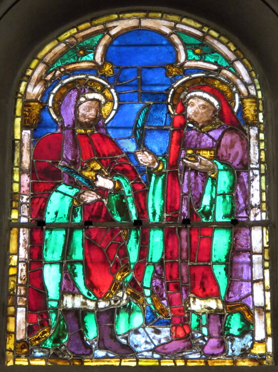 La attribuzione di questa vetratina al Baldovinetti si deve alla Kennedy che la ritiene opera di un artista influenzato dall’Angelico e dal Castagno, quale per l’appunto Alesso Baldovinetti, alla sua prima prova quale maestro di vetrate. Baldovinettiani sono per la studiosa il semplice rigoroso impianto dei due santi entro l’edicola, le loro espressioni intense, e, soprattutto il vivido accostamento delle larghe tessere vitree, memore della prassi compositiva del mosaico cui il Baldovinetti era uso; particolarmente raffinato, annota la Kennedy, l’andamento a chiasma degli accostamenti cromatici: un santo indossa berretto e veste rossi accostati al mantello violetto, l’altro inversamente berretto e veste viola accostati al mantello rosso. L’attribuzione della Kennedy è stata concordemente accettata dal Marchini e dalla critica posteriore [269].