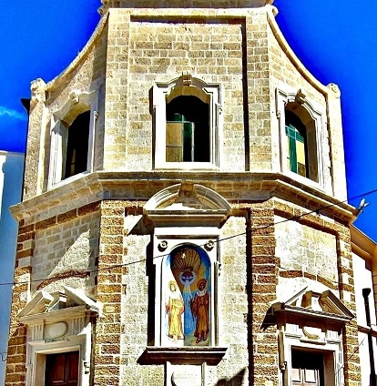 hanno in documenti del secolo XVI; la chiesa primitiva crollò nel 1722 per cause non definite. I lavori della nuova chiesa terminarono nel 1731, ma il terremoto del 1743 la rese inagibile; riedificata a spese del Capitolo e della confraternita dei nobili. In seguito a un nuovo cedimento la chiesa rimase chiusa per parecchi anni; fu recuperata alle sue funzioni negli anni 1923-1924. La chiesa è a pianta esagonale; la facciata si sviluppa su tre lati dell’esagono: il lato centrale è cieco e i due laterali con i due portali architravati sono racchiusi fra alte resene; il lato centrale ha una nicchia con volta a tutto sesto sormontata da un timpano interrotto dove sono collocati i simulacri dei due santi. Una doppia cornice separa la facciata in due parti, nella parte superiore tre grandi finestre con vetrate a colori illuminano l’interno, la facciata termina con timpano interrotto che fa ornamento a un crocefisso di ferro. All’interno si conservano tele del tardo Settecento tra le quali una Madonna del Carmine e anime purganti. Sull’altar maggiore vi è una pala di scuola napoletana che raffigura i due Santi Medici.