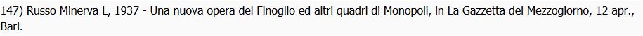 Per la chiesa dei paolotti di Conversano il Finoglio eseguì una copia della pala di Iacopo Palma il Giovane, conservata nella cattedrale di Monopoli, con La Vergine col Bambino e i ss. Rocco e Sebastiano [136]. Il medesimo Ordine gli commissionò anche, per la chiesa di S. Angelo in Monopoli, la tela con La Vergine col Bambino e i ss. Eligio e Trifone [142], uno dei culmini artistici del Finoglio [147, 141]. L'ultima tela eseguita dal nostro è considerata i santi Benedetto e Biagio, eseguita per l'altare maggiore della chiesa di S. Benedetto a Conversano [139], in cui è evidente un autentico gusto "barocco", che l'avvicina alle coeve realizzazioni romane e nordeuropee.
